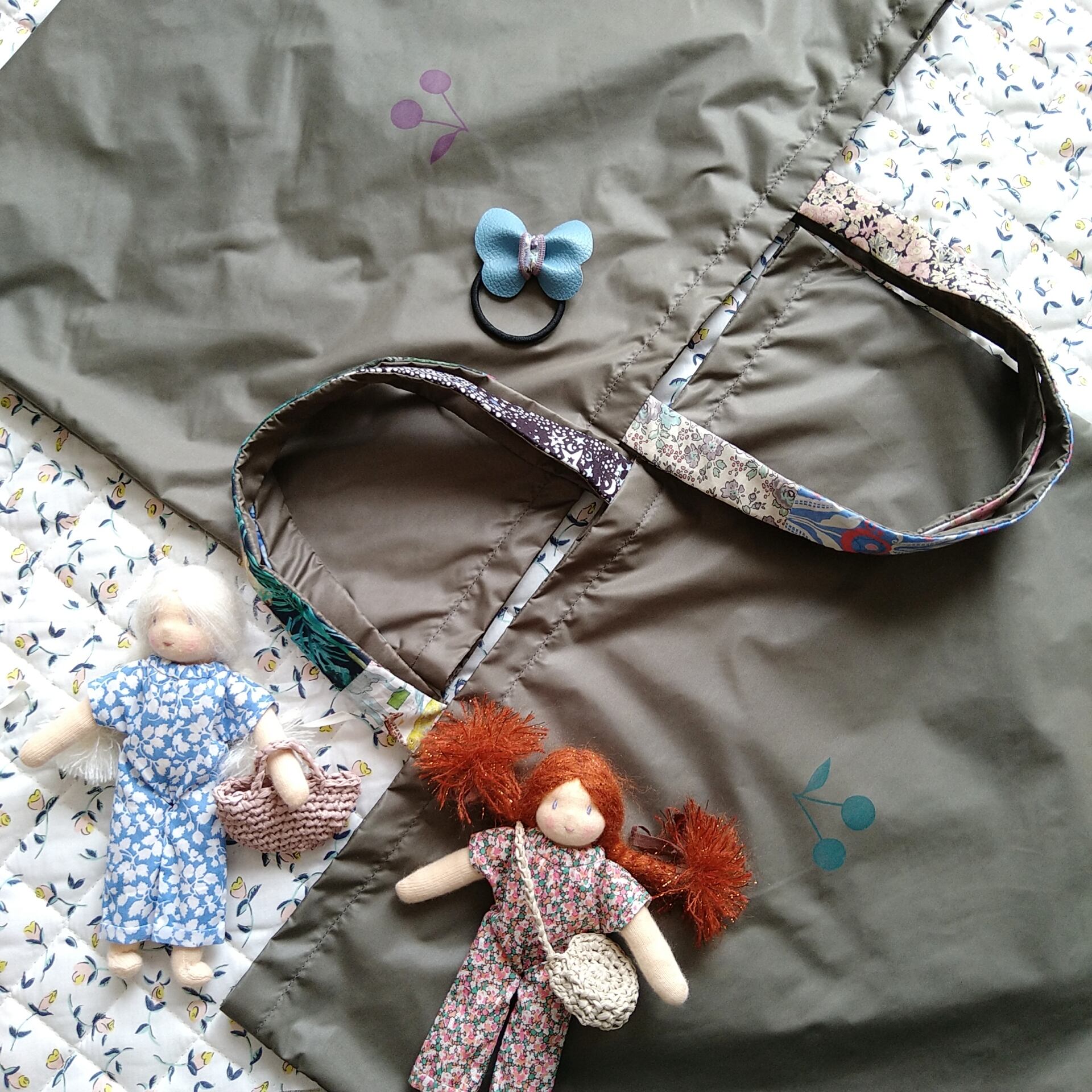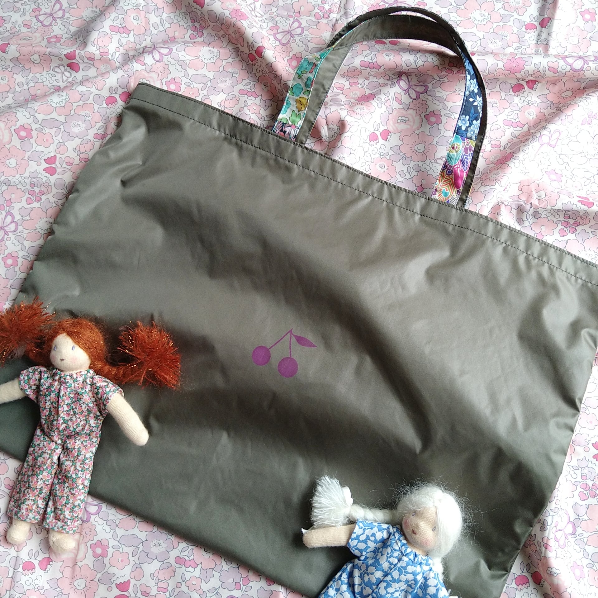 ほんのり光沢のある高品質撥水ナイロンとリバティパッチワークのレッスンバッグ。